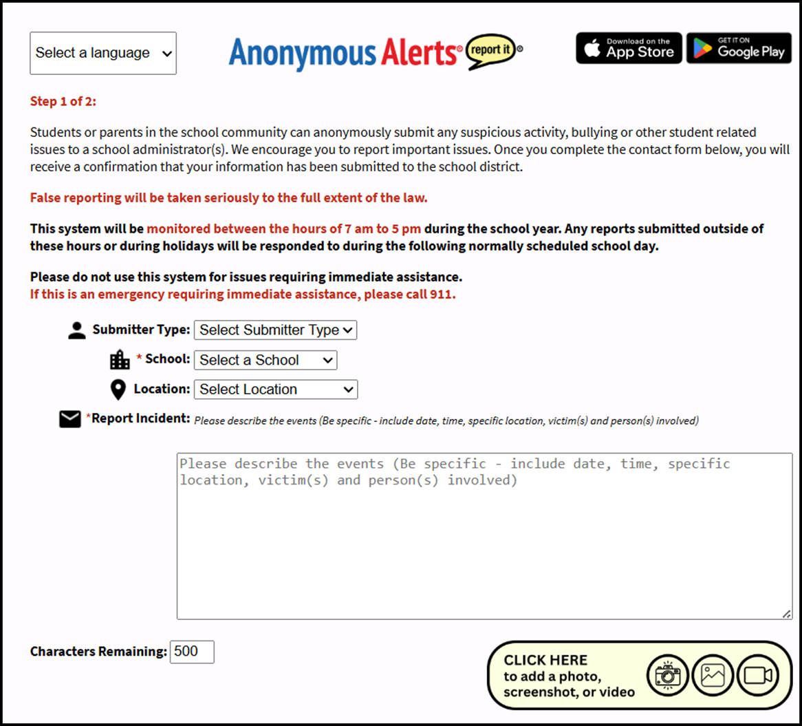 Students or parents in the school community can anonymously report bullying, safety issues or other sensitive student issues through a custom branded website.